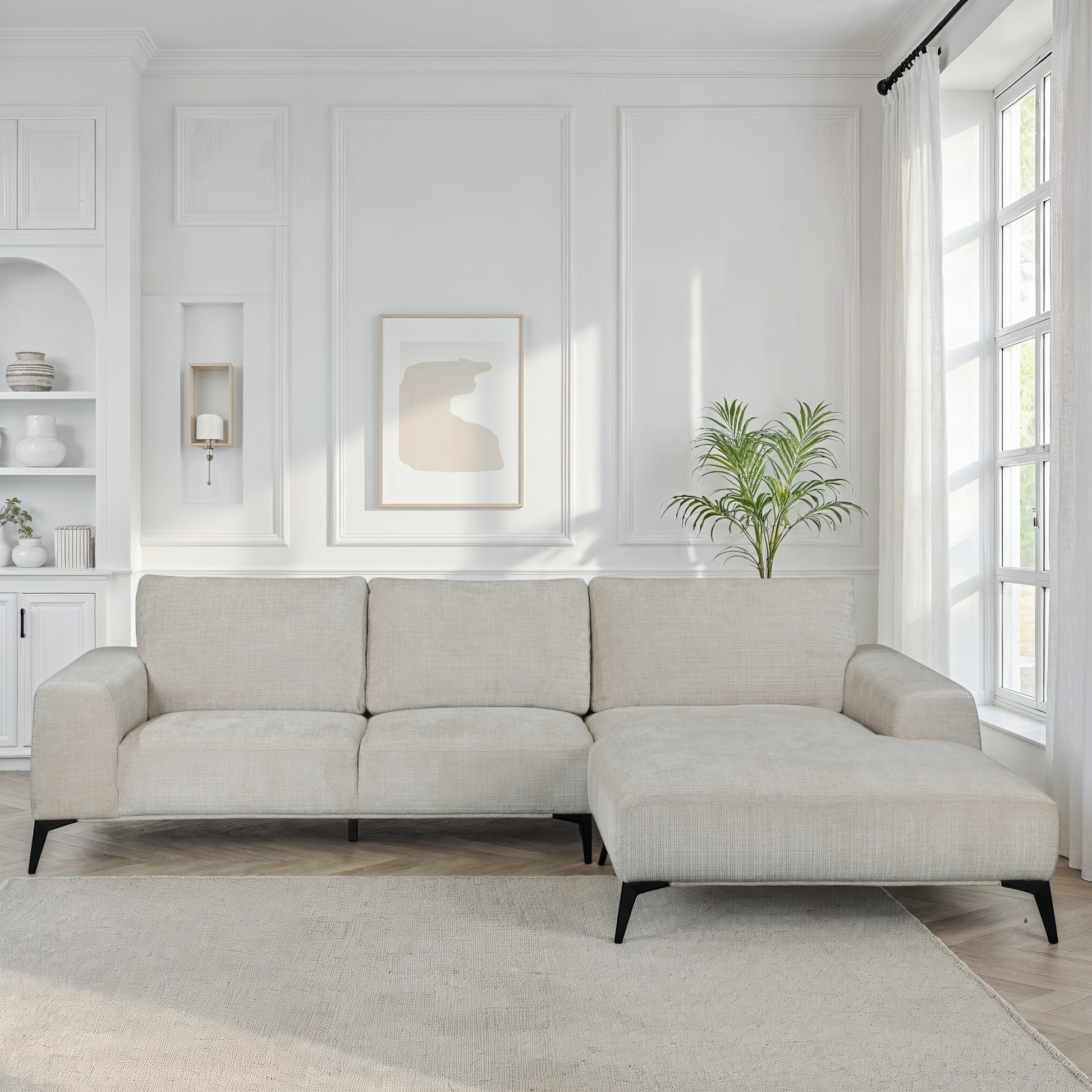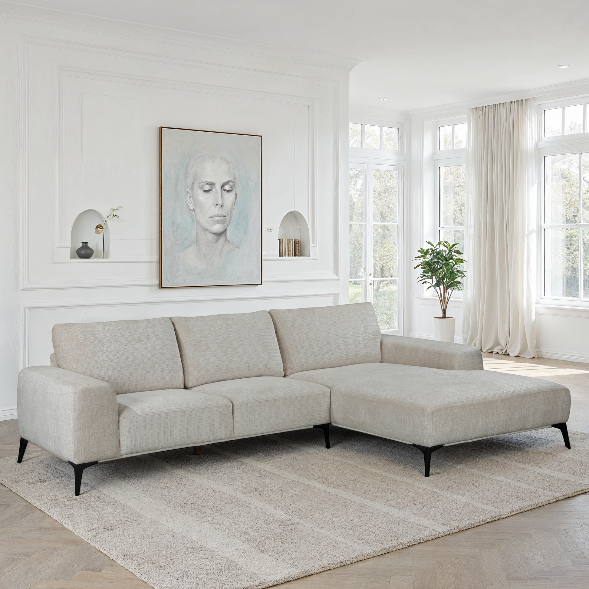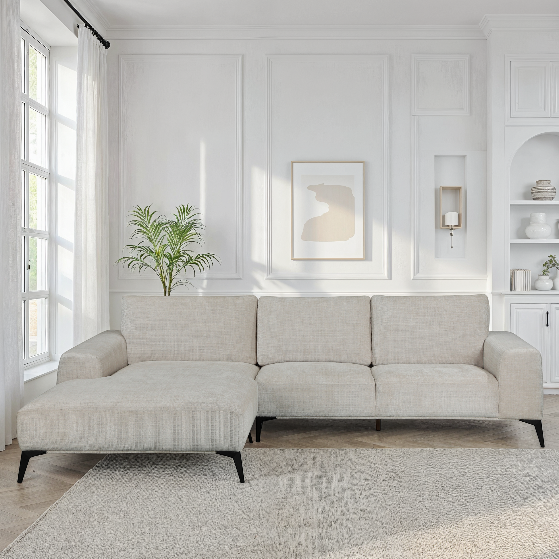 Canapé d'angle désign Helena 5-places avec grande banquette pour s'allonger à deux . Revêtement en tissu de qualité prémium en Polycotton . Armature en bois massif. Pieds: métal peint en noir Mat , Disponible en plusieurs couleurs . Marque et conception : Belge