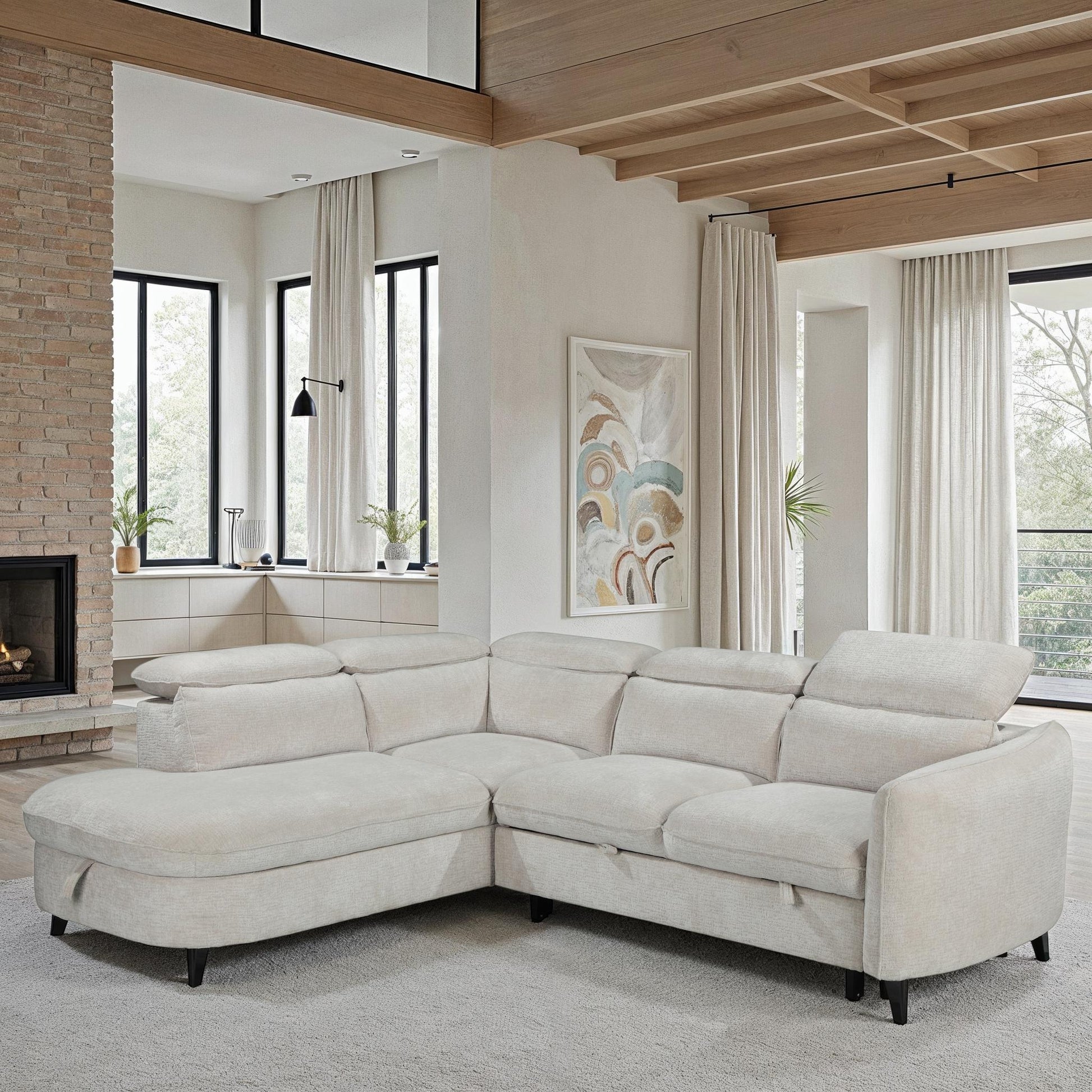Le canapé d’angle RUBY en tissu anti-tache (249x211xH80 cm) séduit par son design moderne, son grand confort et son coffre de rangement pratique.