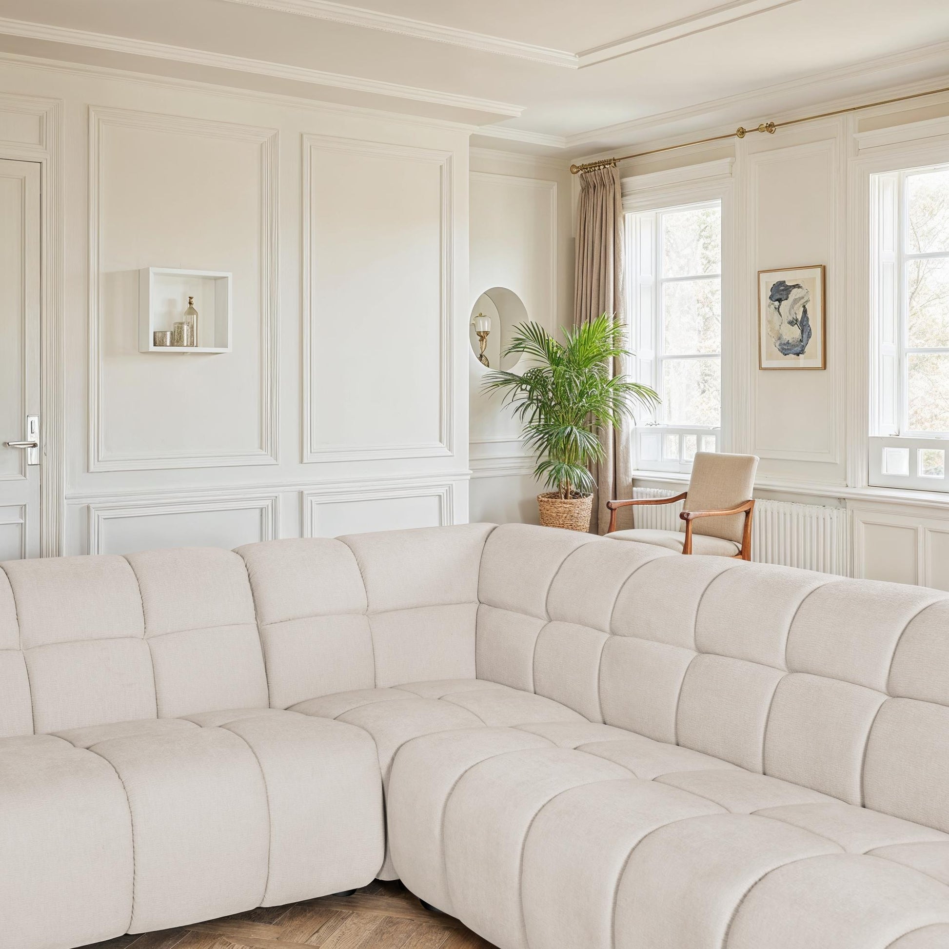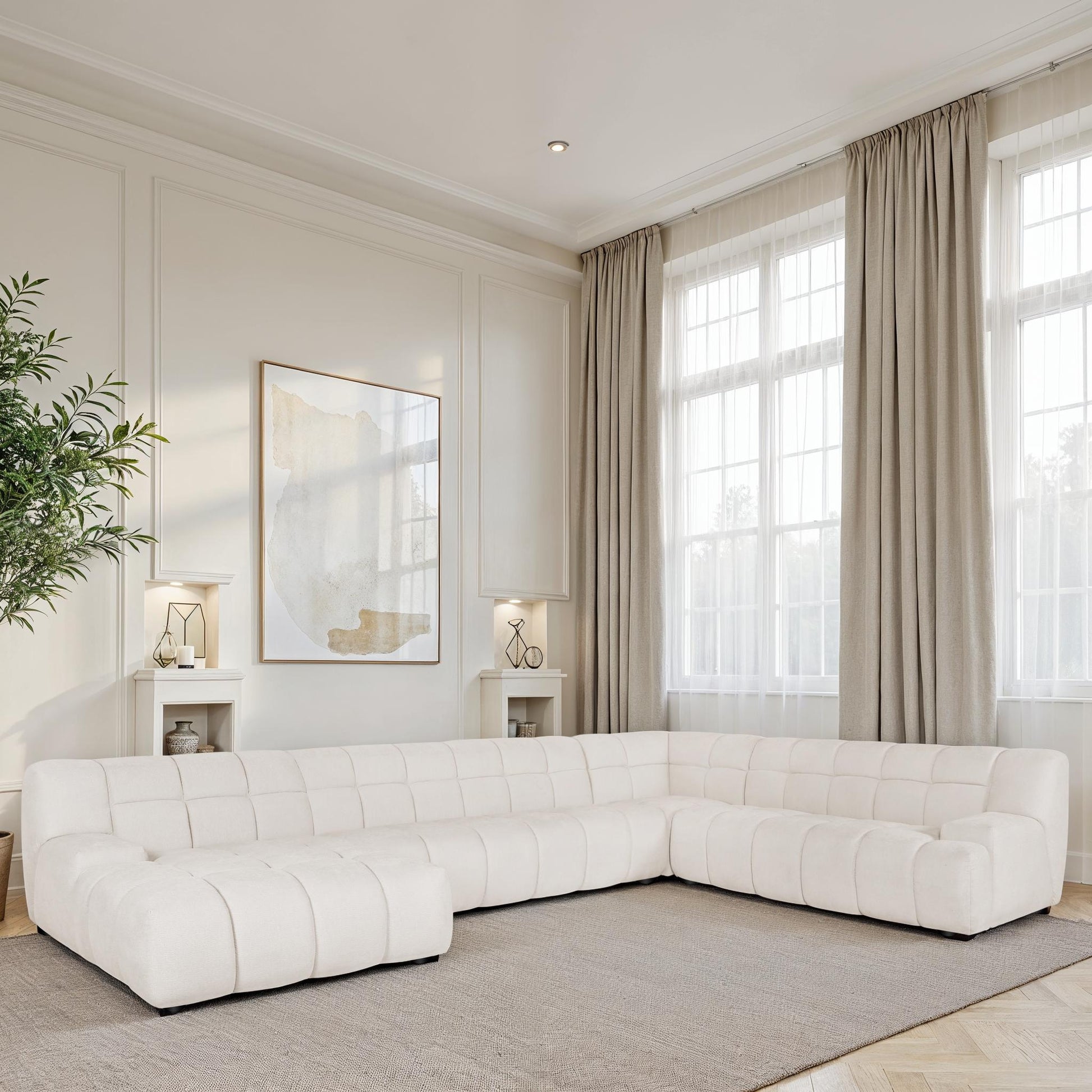 Canapé d’angle ou panoramique en tissu anti-tache, alliant élégance, confort et praticité. Disponible en format classique ou en U pour s’adapter à tous les espaces de vie.