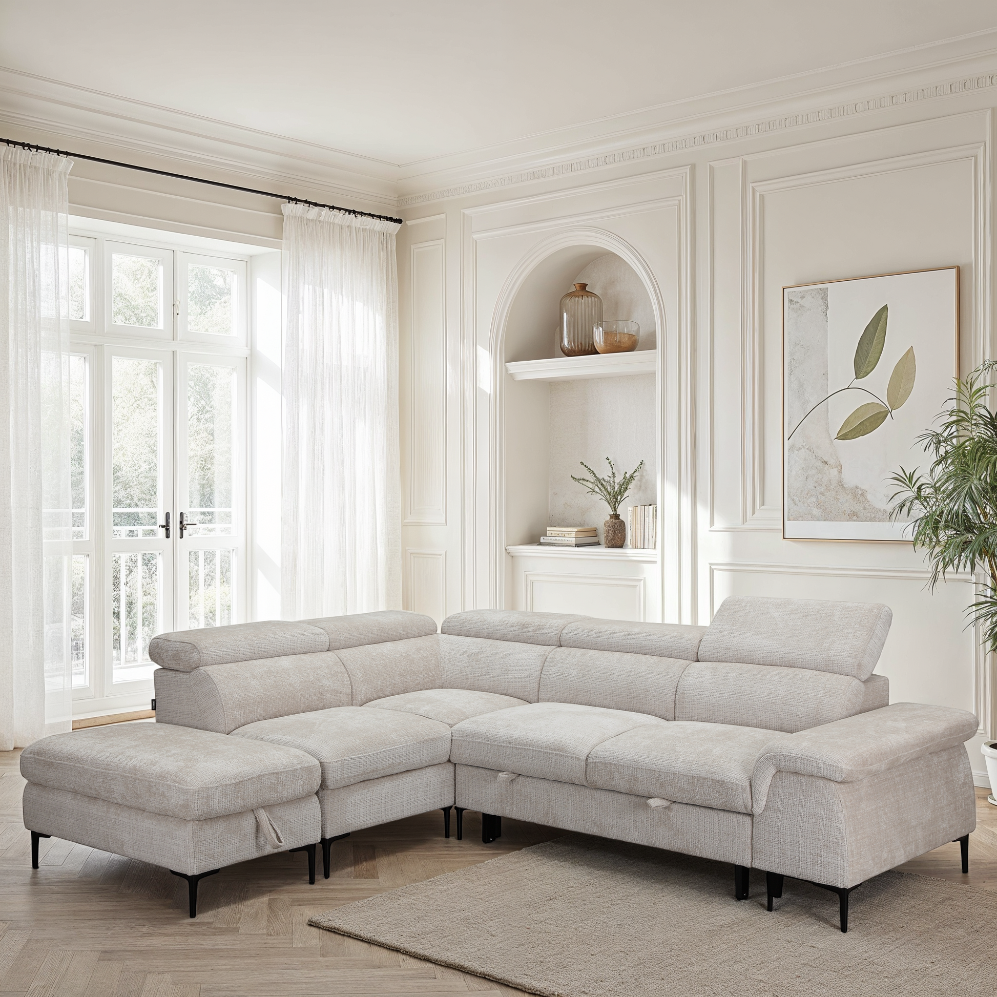 Canapé d'angle repose tête réglables convertible en tissu avec coffre rangement, 258x217xH79/99CM - PINTO