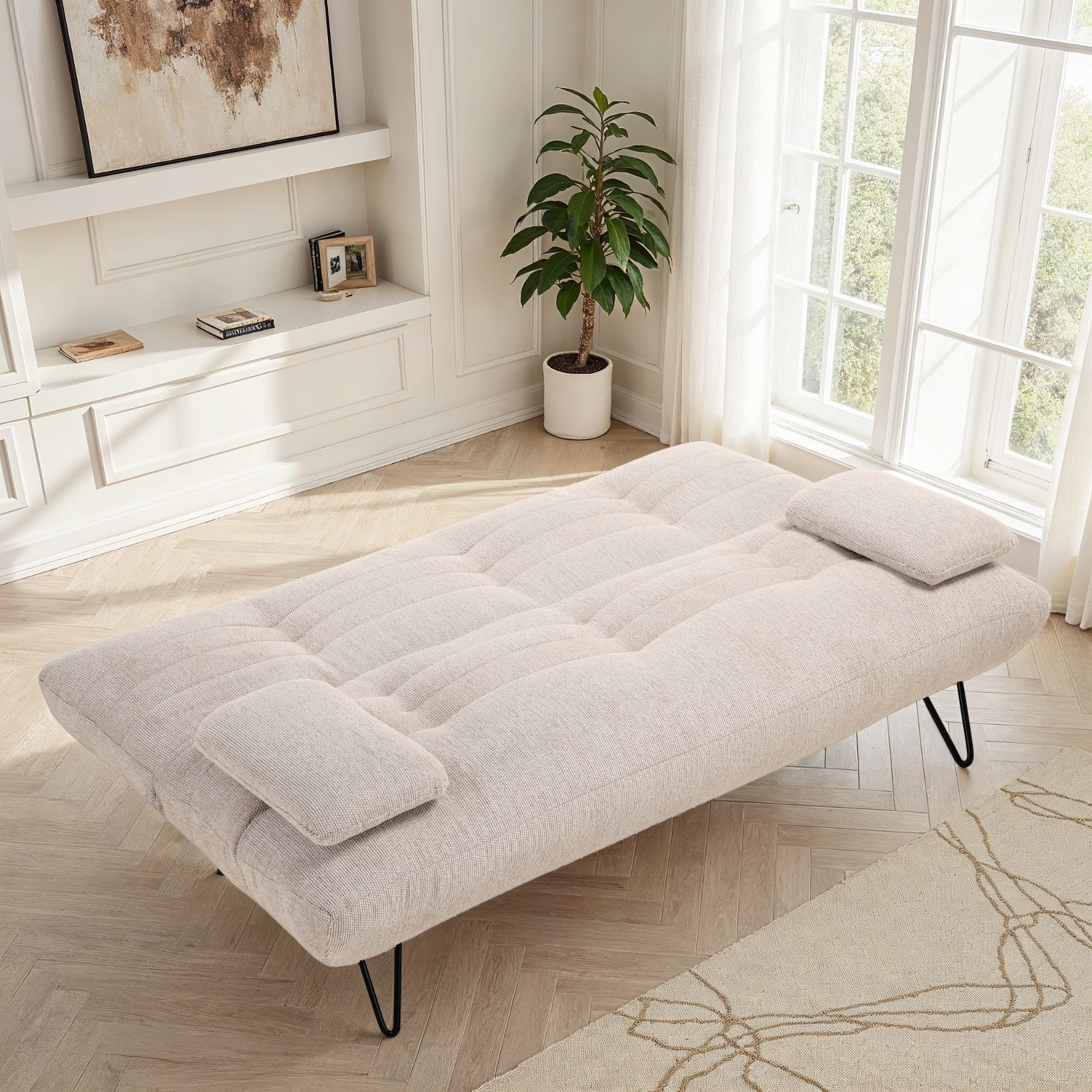 Grâce à son mécanisme clic-clac, ce canapé se transforme rapidement en un lit d’appoint confortable, parfait pour accueillir vos invités ou aménager un studio, une chambre d’amis ou un bureau. Son design sobre et moderne, allié à des lignes épurées, s’intègre aisément à tous les styles de décoration.