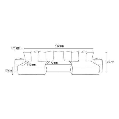 DIMENSIONS DU CANAPÉ : Longueur : 420 cm Largeur : 174 cm Hauteur : 75 cm Profondeur d'assise de la méridienne : 119 cm Profondeur d'assise de la partie centrale : 70 cm Hauteur d'assise : 47 cm Hauteur des pieds : 3 cm DIMENSIONS DES COLIS : Colis 1 : 121 x 88 x 48 cm / 32,4 kg Colis 2 : 121 x 81 x 65 cm / 36,4 kg Colis 3 : 111 x 137 x 48 cm / 40,4 kg Colis 4 : 111 x 137 x 48 cm / 40,4 kg Colis 5 : 121 x 41 x 65 cm / 25,4 kg Colis 6 : 111 x 81 x 65 cm / 44,4 kg