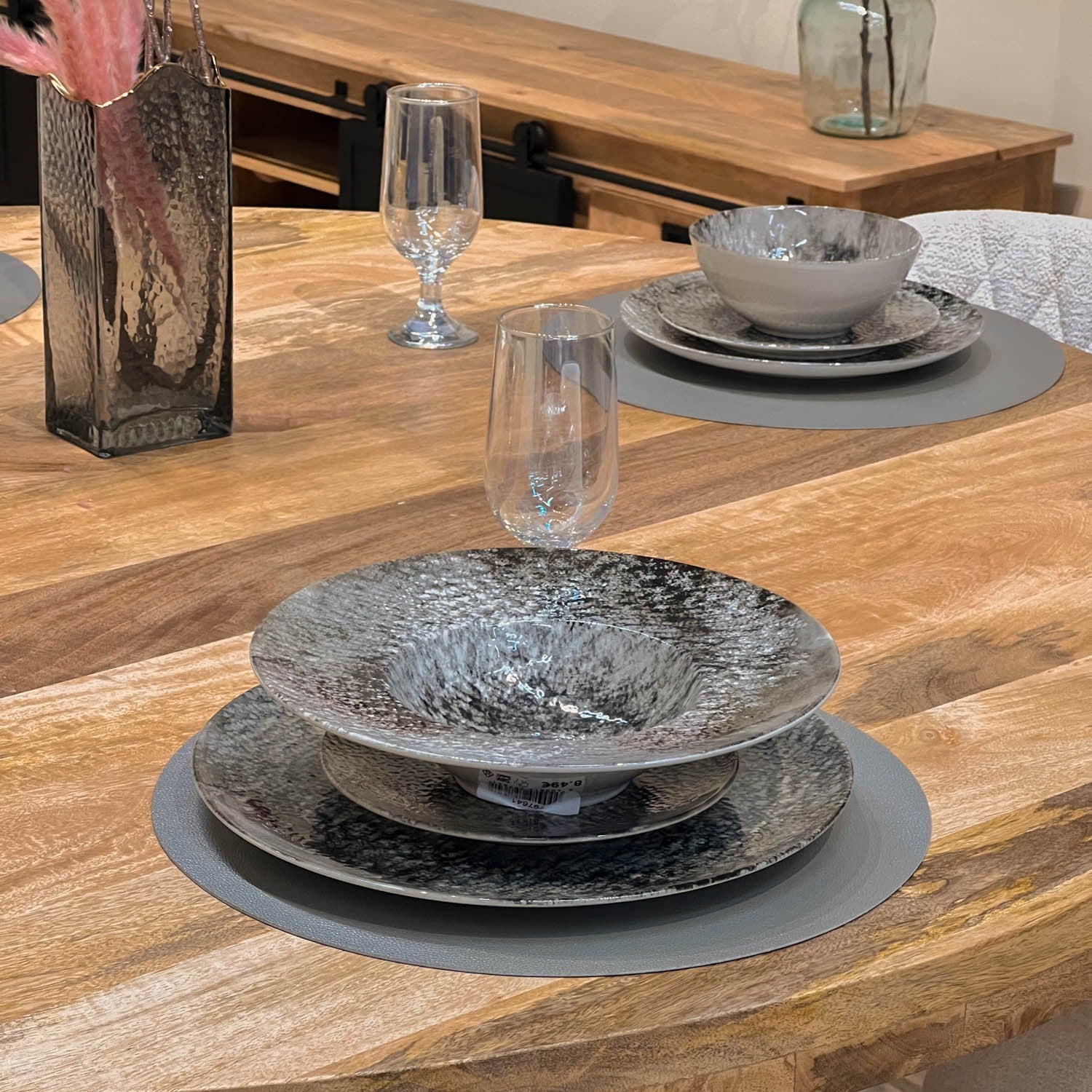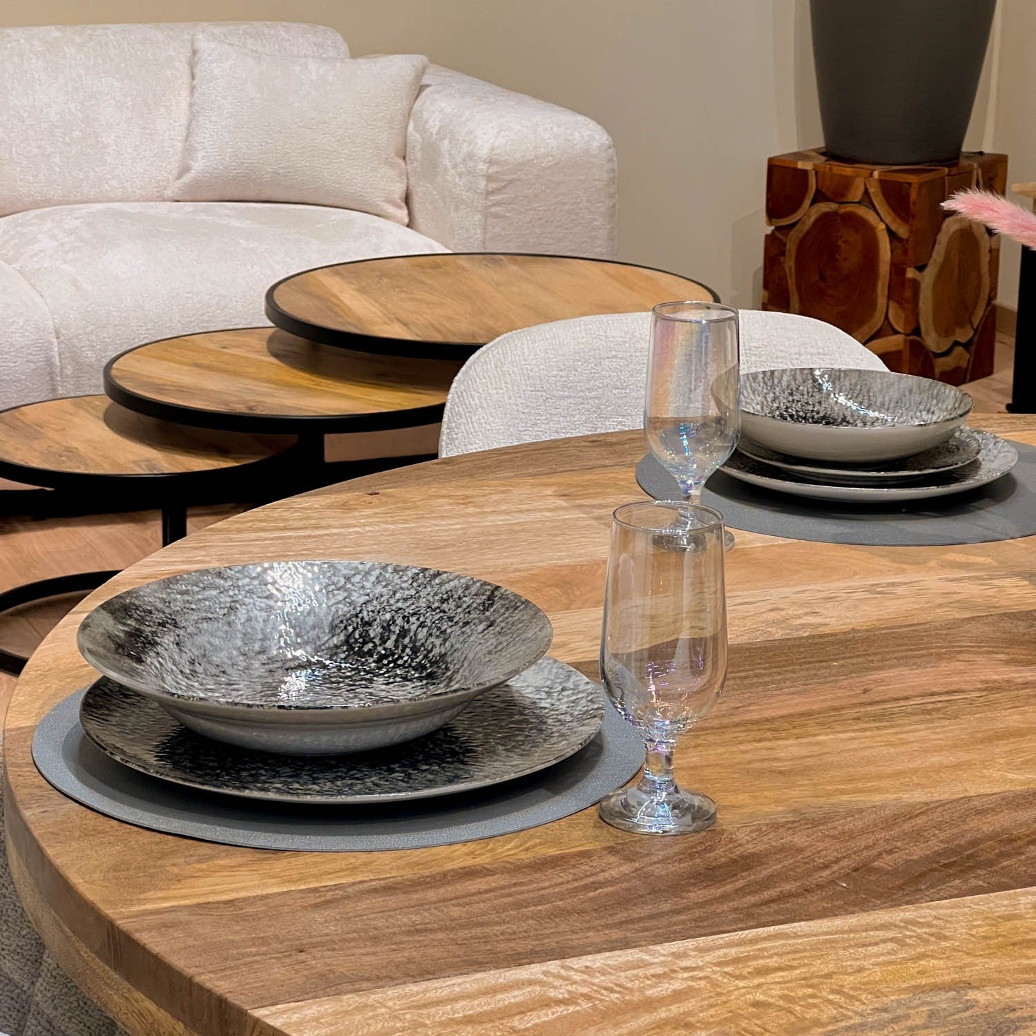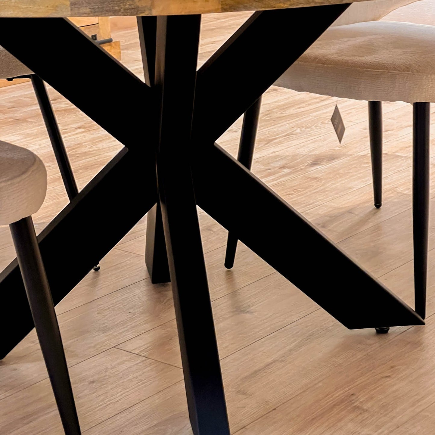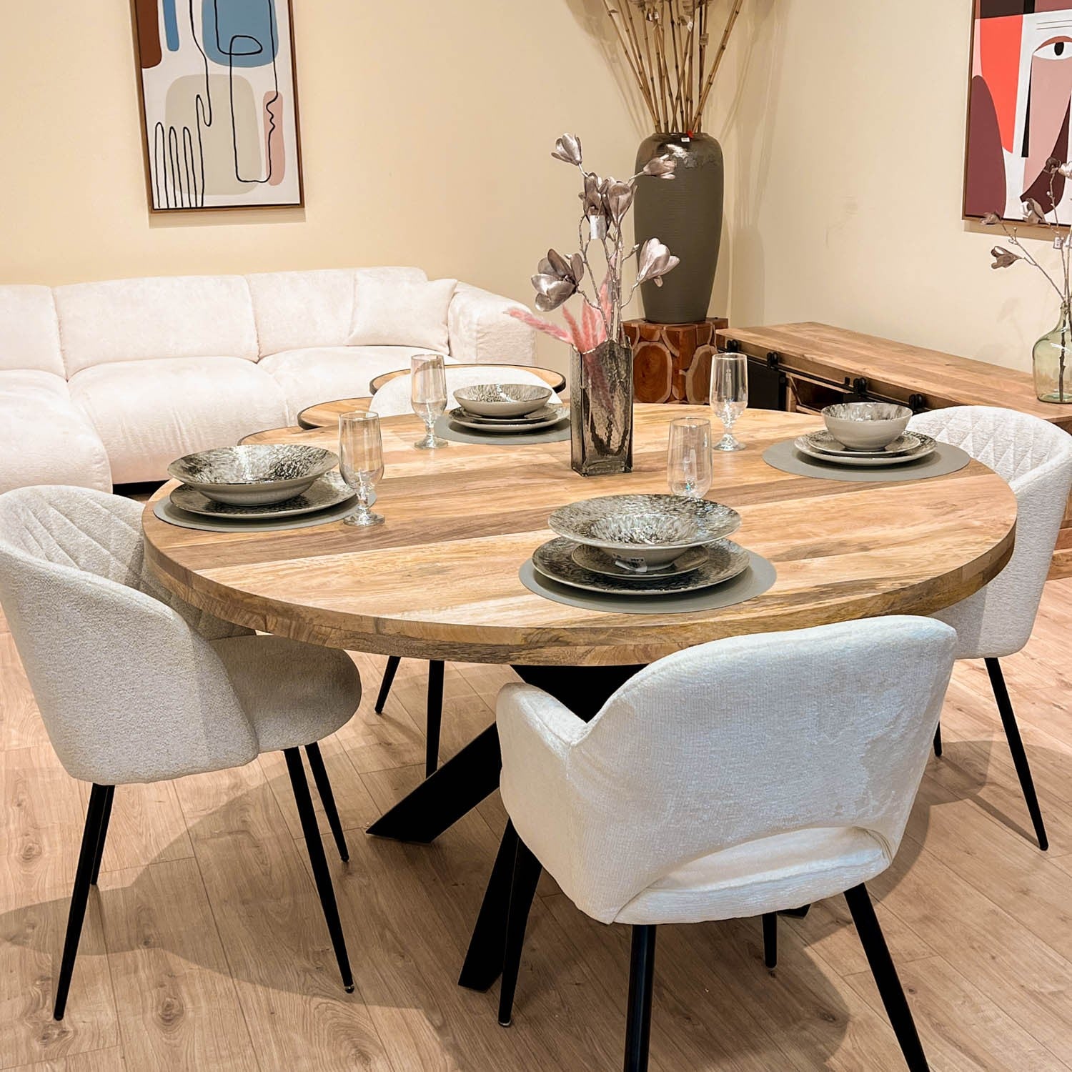 La table à manger ronde  est fabriquée en bois de manguier robuste. Le grain unique du bois donne à chaque meuble en bois de manguier un aspect spécial et individuel. Le bois est connu pour son grain fin et ses différentes nuances de couleurs. Le bois est d'un brun doré clair à foncé avec des rayures jaunes et roses qui le traversent. Le plateau de 4,5 cm a une finition rugueuse qui le rend très solide. La table peut accueillir 6 personnes.  Veuillez noter que le plateau de la table est grossièrement gratté et n'est donc pas plat. Décor Manguier Brut Forme Rond Nombre de personnes 6 personnes Marque Zoli99 Couleur Brun, Noir Style Industriel Matériau Bois de manguier Conseils d'entretien Nettoyez avec un chiffon et un nettoyant doux dans le sens du grain du bois. Essuyez immédiatement après le nettoyage pour empêcher l'eau de s'accumuler sur les meubles. De temps en temps, il est conseillé de mettre une nouvelle couche d'huile sur les meubles avec une finition huilée. Métal Nettoyez avec un chiffon et un détergent doux, essuyez bien ensuite. Pour éviter les rayures, n'utilisez pas de nettoyants abrasifs. Pour les éléments en cuivre ou chromés, utilisez un produit de polissage spécial.