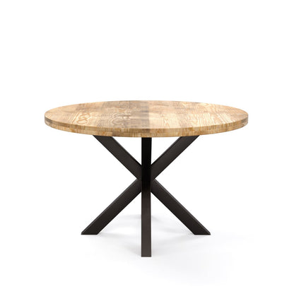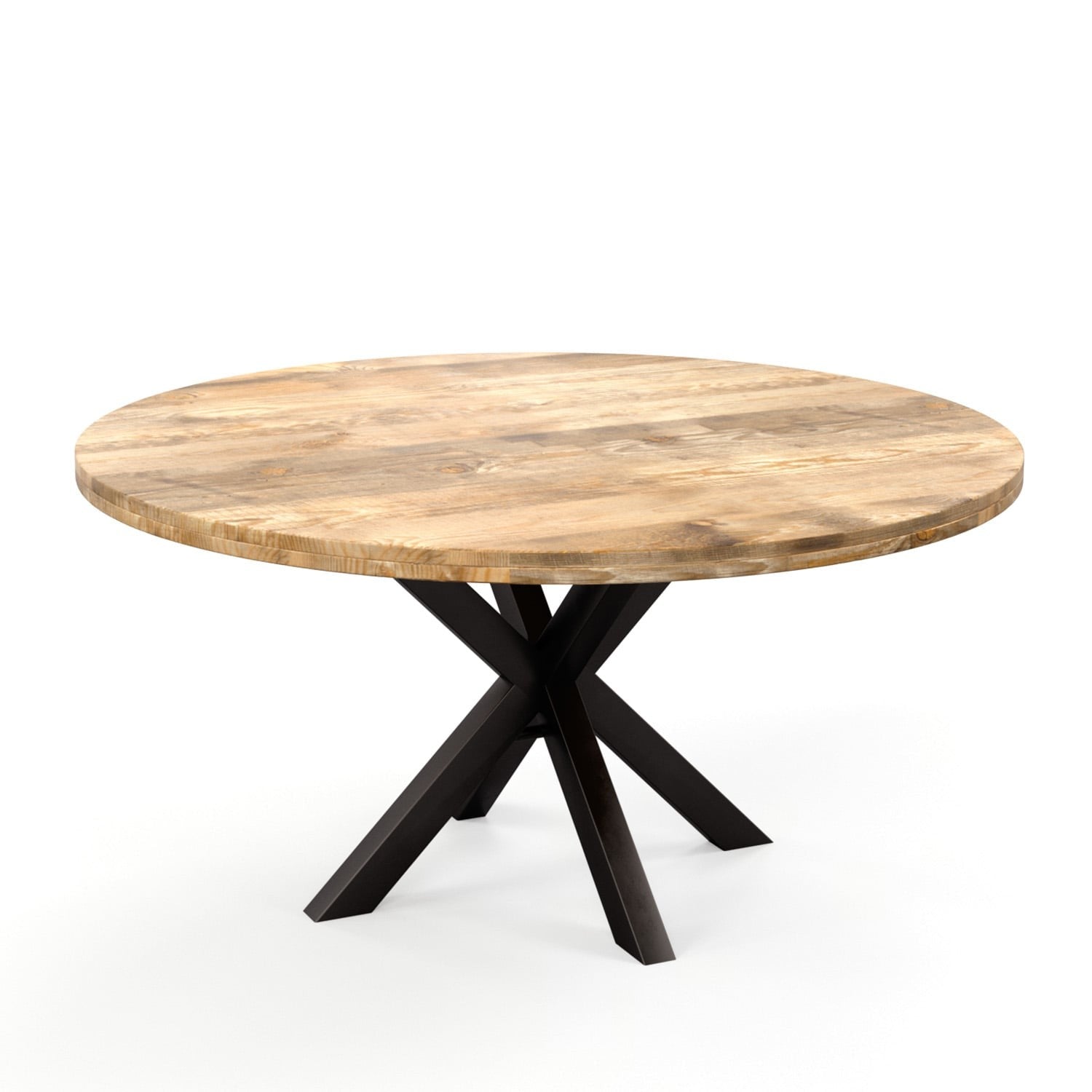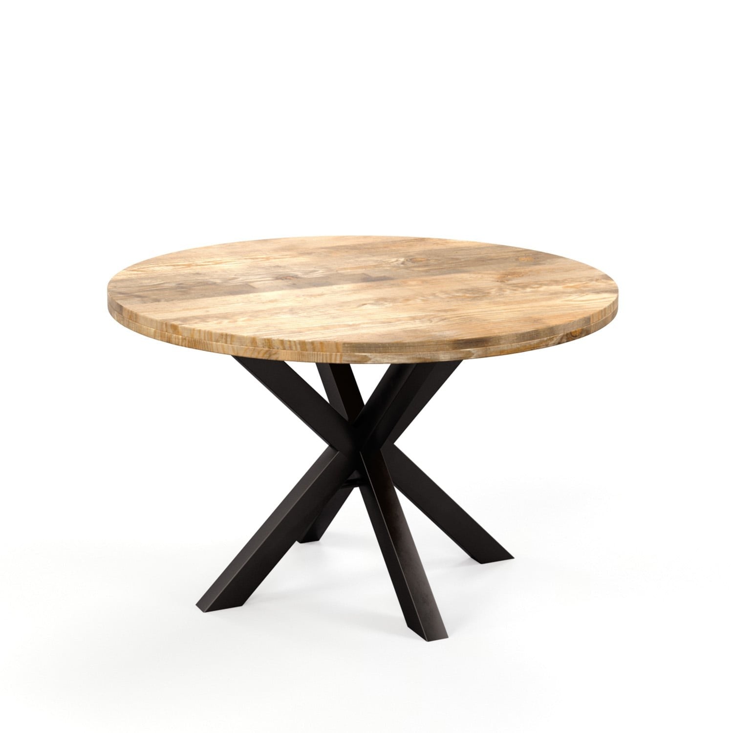 Table à manger ronde en bois de manguier massif, au style industriel. Chaque pièce est unique grâce aux nuances naturelles du bois. Plateau épais de 4,5 cm avec finition brute, pouvant accueillir jusqu'à 6 personnes. Structure robuste avec détails en métal noir.
