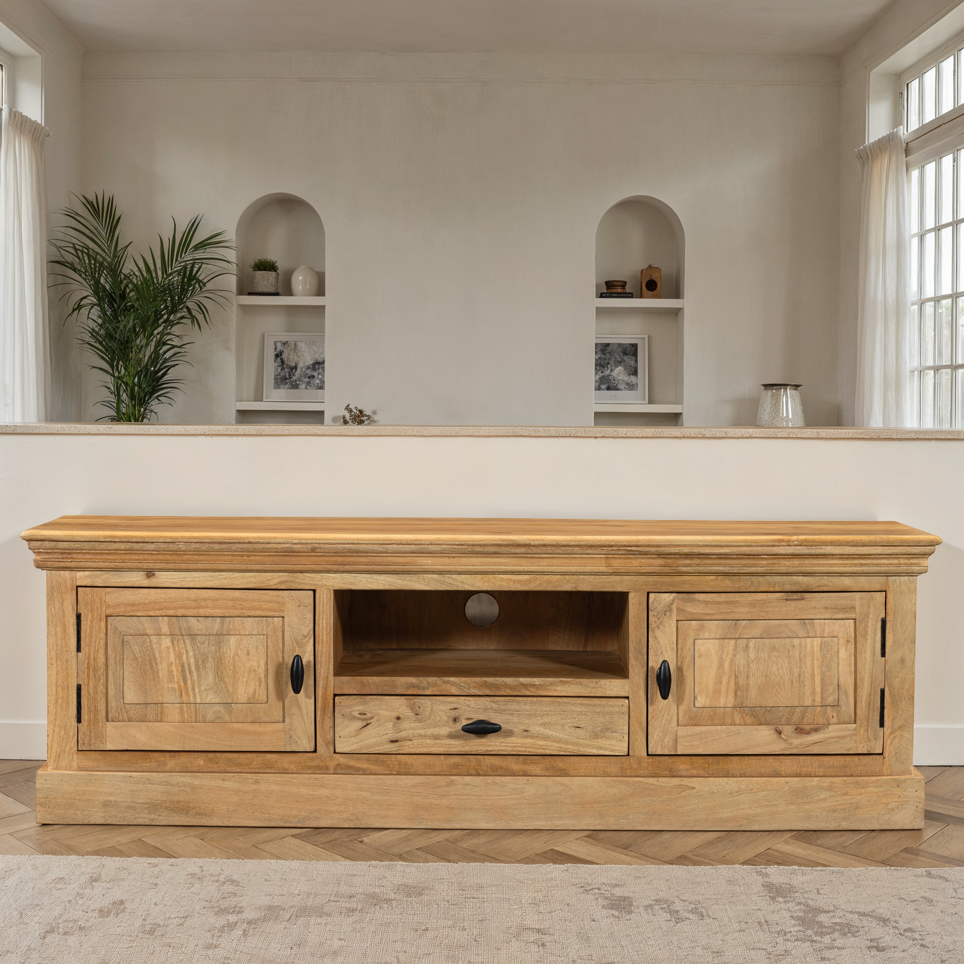 Le meuble TV ORLANE en bois de manguier avec compartiments de rangement allie style naturel, robustesse et praticité pour un salon organisé et élégant.