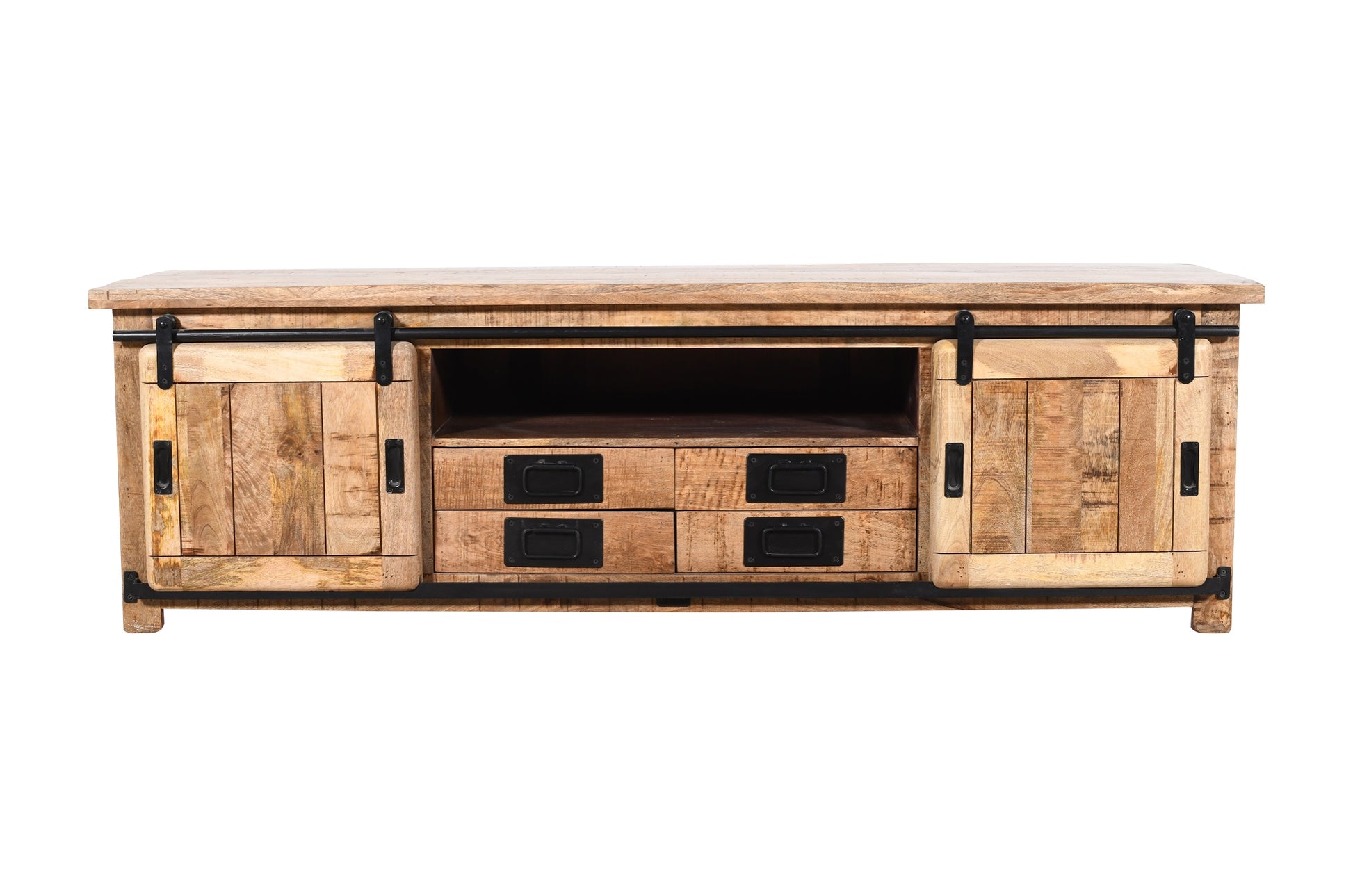 Son plateau large accueille téléviseur, décoration ou enceintes, tandis que ses rangements ouverts ou fermés permettent de dissimuler box, consoles, télécommandes ou câbles en toute discrétion. La finition naturelle du bois de manguier révèle un veinage unique, apportant chaleur et texture à votre intérieur.
