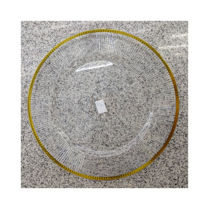 Élégante assiette en verre transparent de 33 cm, rehaussée d’un délicat liseré doré. Parfaite pour sublimer vos présentations de table avec raffinement.