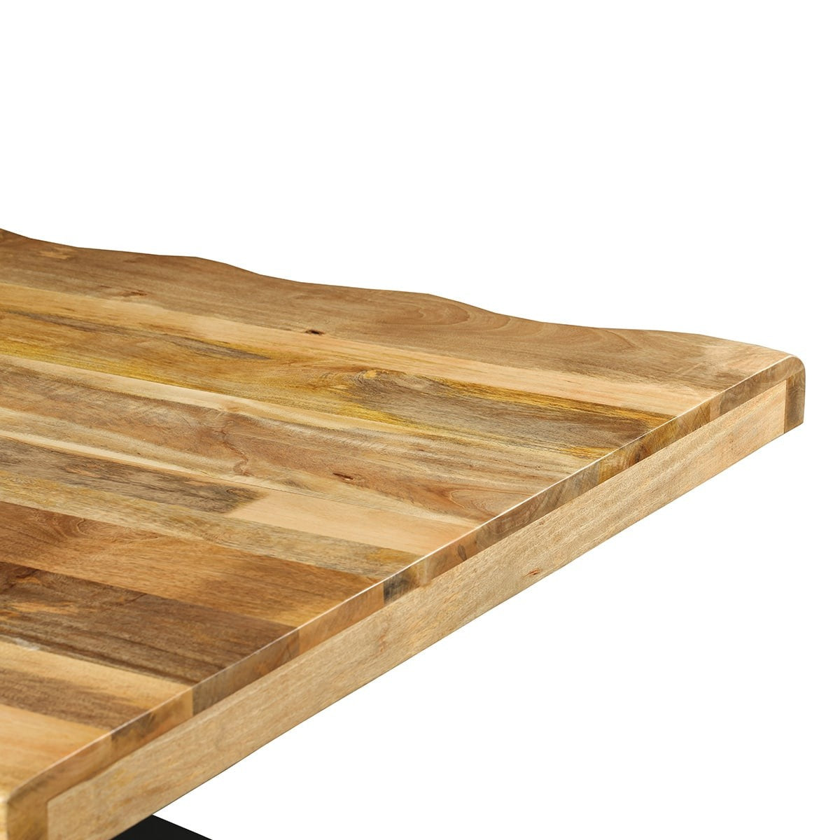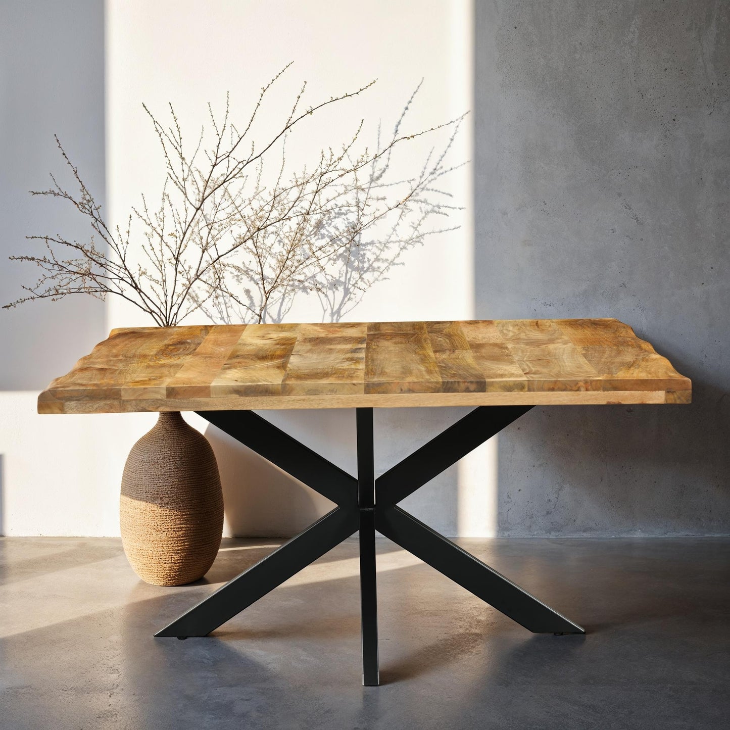 Fabriquée avec soin, chaque table met en valeur les veines uniques et les teintes chaleureuses du bois, offrant une pièce de caractère qui attire tous les regards. Le choix d'un plateau épais confère une solidité et une présence visuelle remarquables, tandis que la finition artisanale souligne son aspect authentique et intemporel. Cette table est conçue pour durer, que ce soit pour des repas quotidiens ou pour des occasions spéciales, apportant un sentiment de raffinement à chaque moment. Les pieds en métal noir, au design minimaliste et robuste, créent un contraste saisissant avec le bois ondulé du plateau. Leur style industriel s'intègre harmonieusement dans les intérieurs contemporains tout en s'adaptant parfaitement aux décors plus classiques. Grâce à leur stabilité et à leur durabilité, ces pieds garantissent une utilisation pratique et fiable. L'association du bois naturel et du métal noir donne vie à une table aussi fonctionnelle qu’esthétique, véritable pièce maîtresse de votre salle à manger.