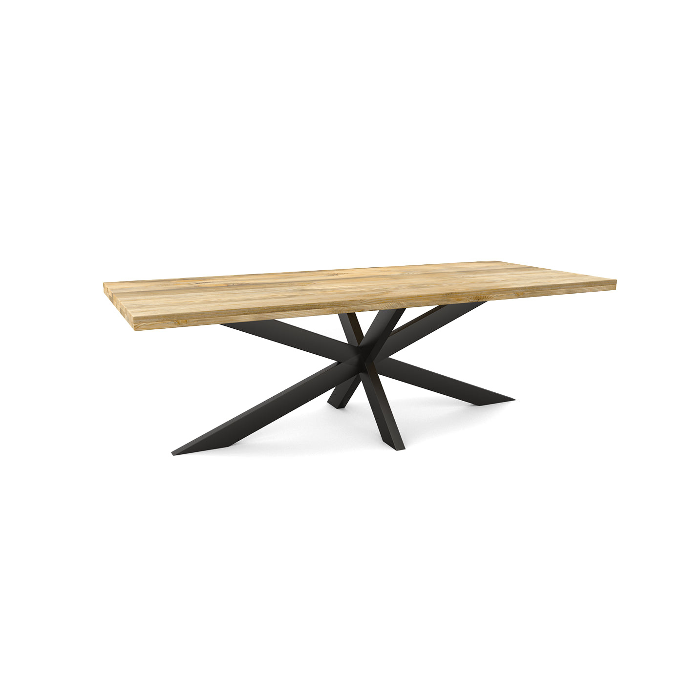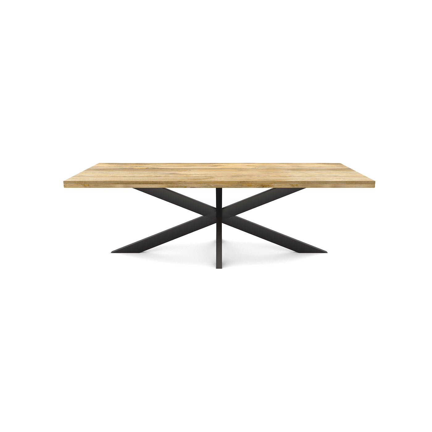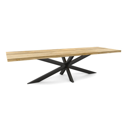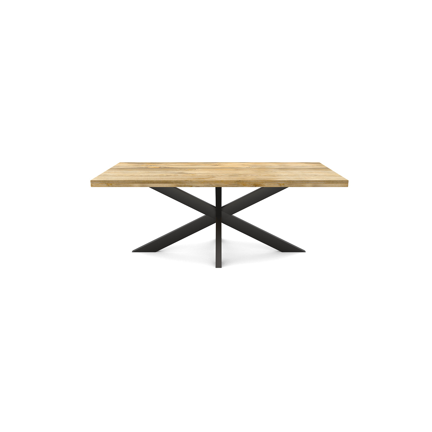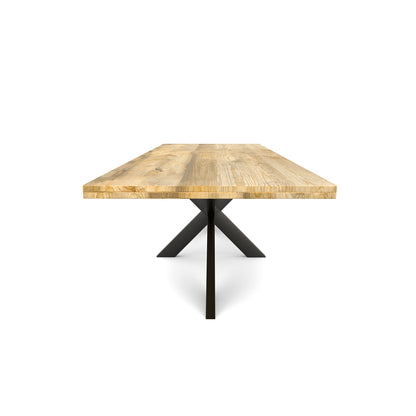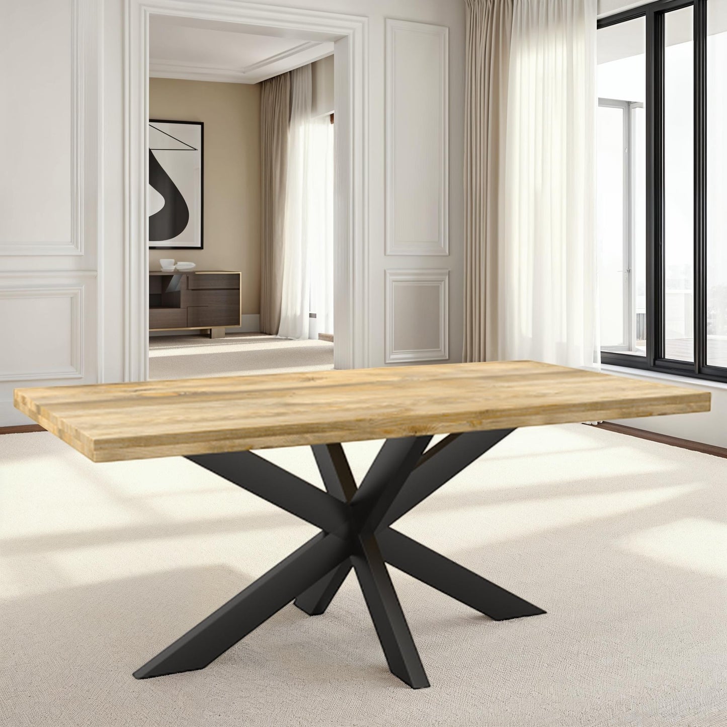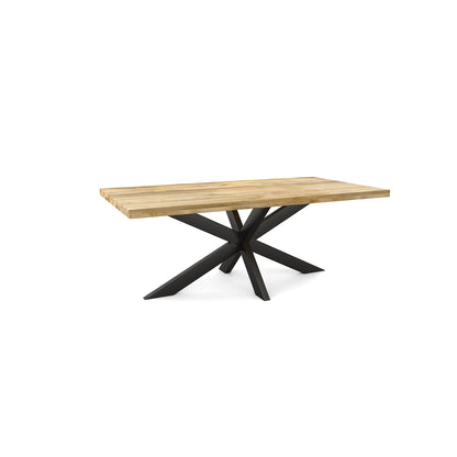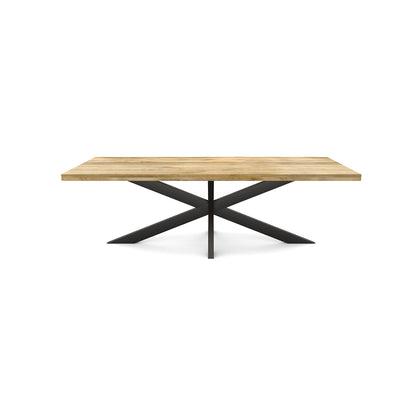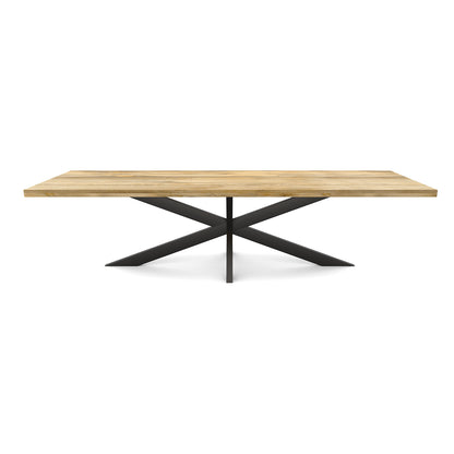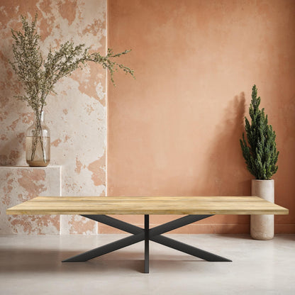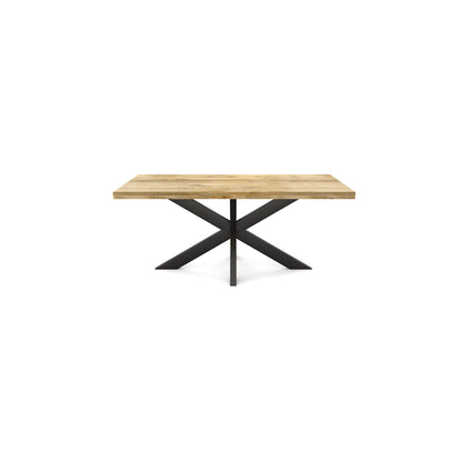 La table de salle à manger rectangulaire FLAVIA est fabriquée en bois de manguier. Le bois de manguier est traité avec un vernis transparent. Le plateau a une épaisseur de 5.5 cm, dont 3 cm sont épaissis. La table a un pied matriciel en métal laqué noir.