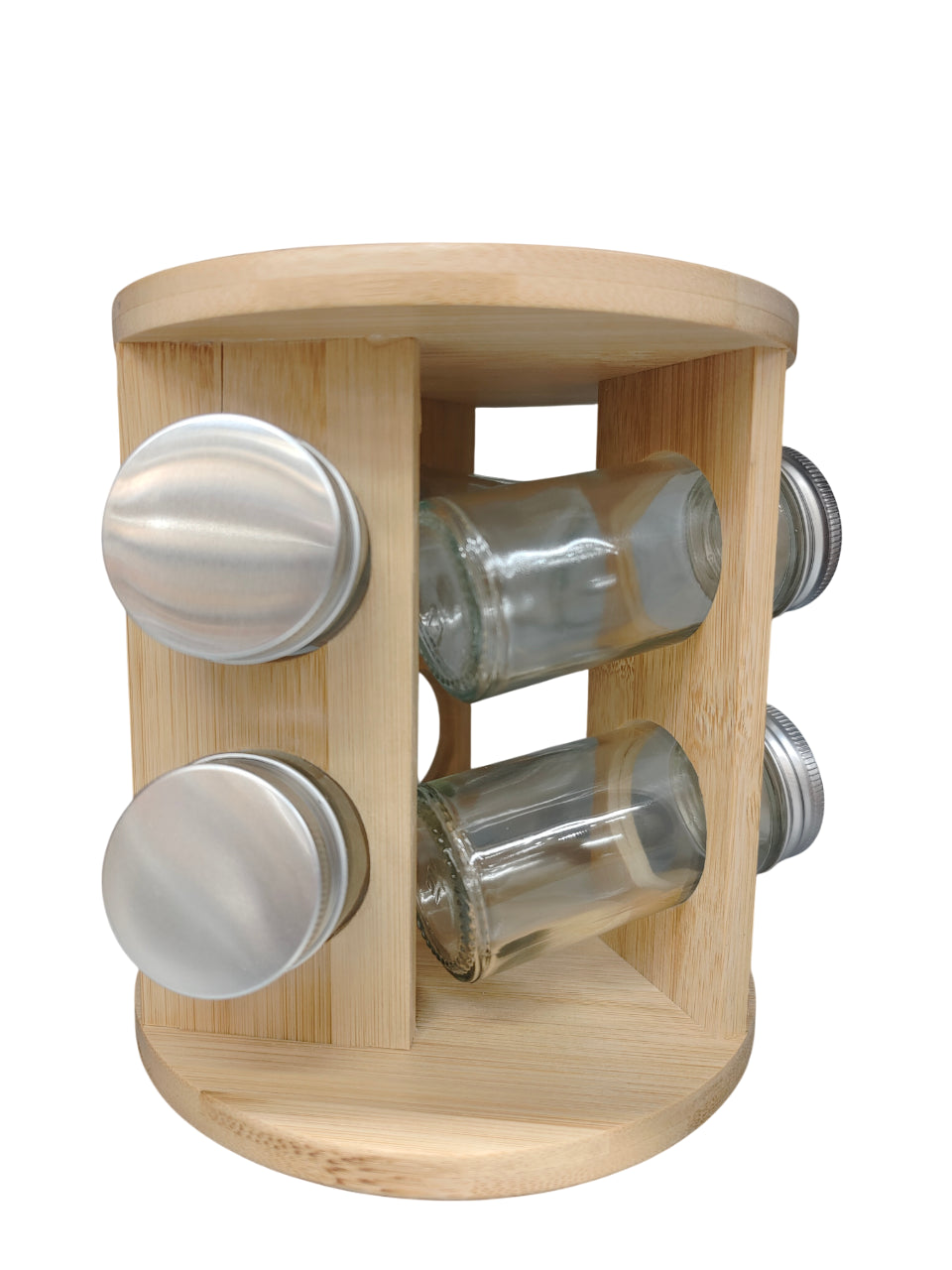Ustensiles de cuisine, 6 bouteilles en verre avec récipient en bois, D15,5xH17,3CM