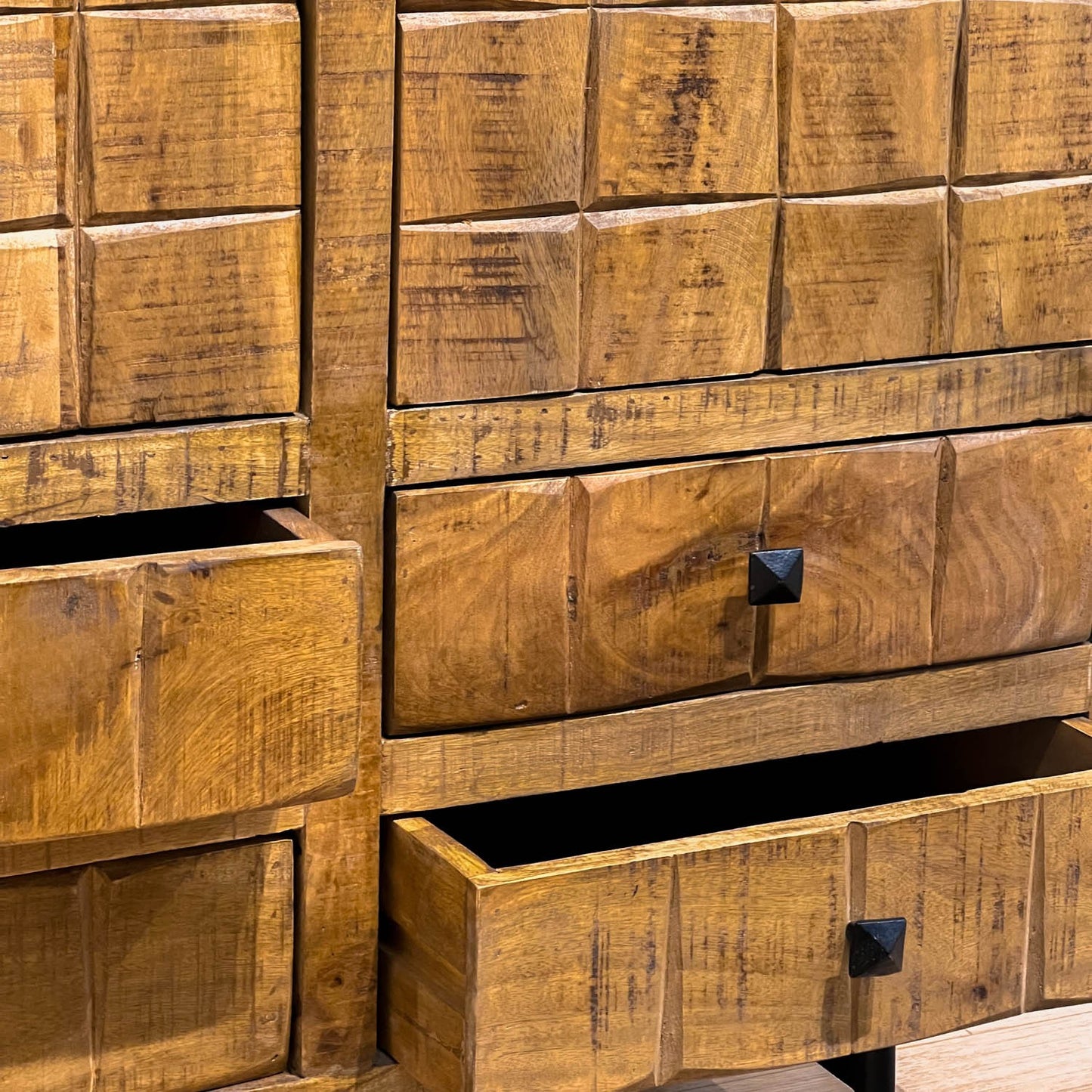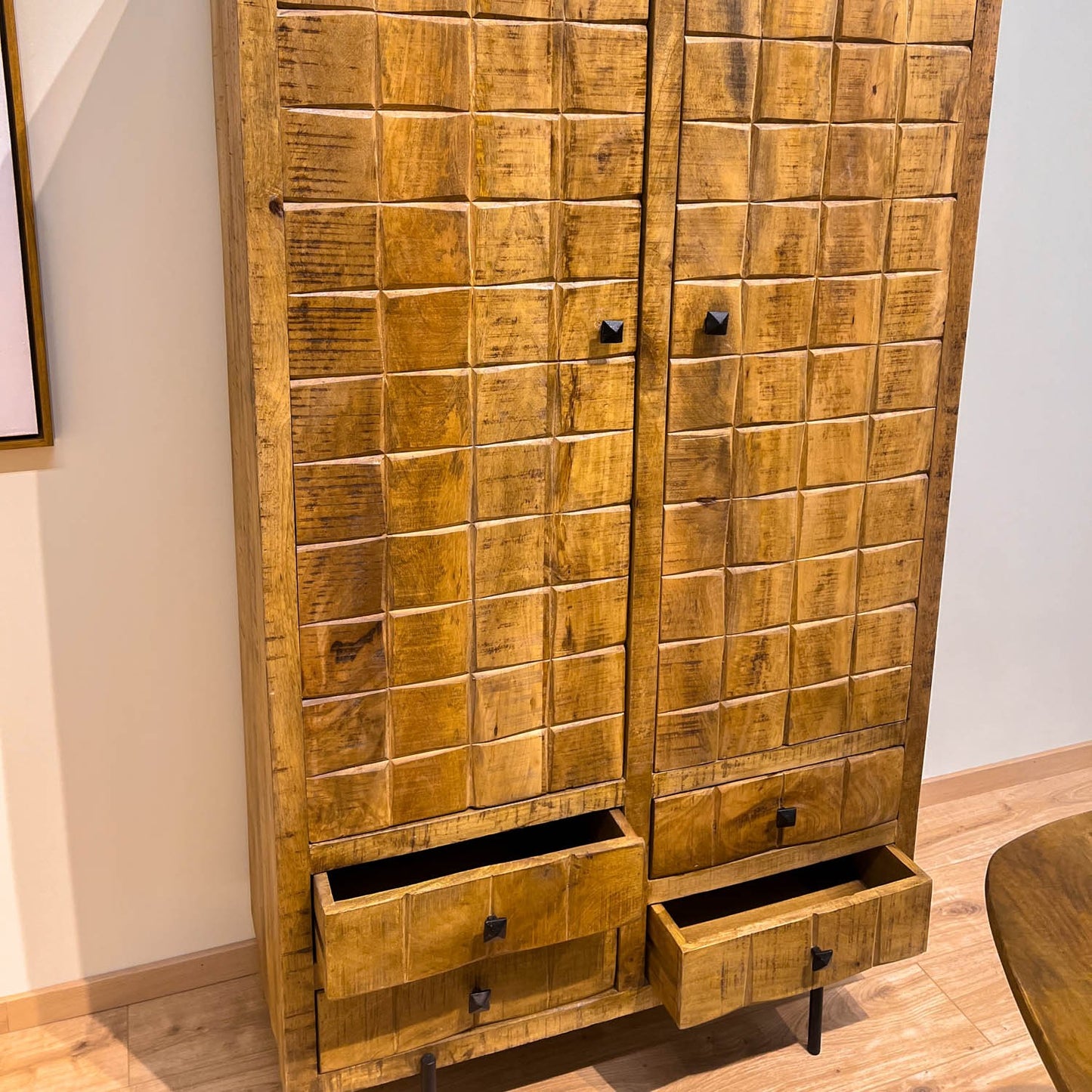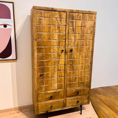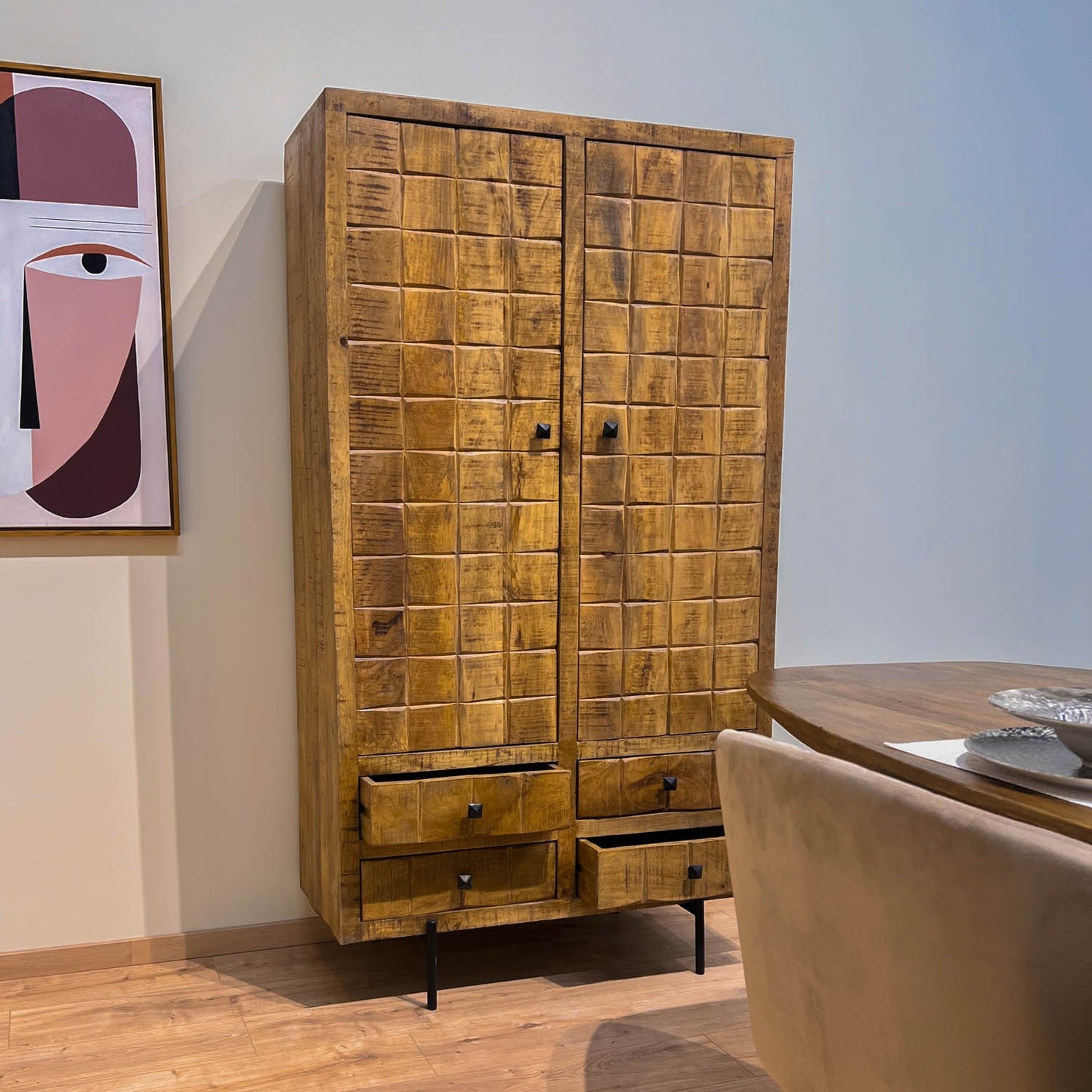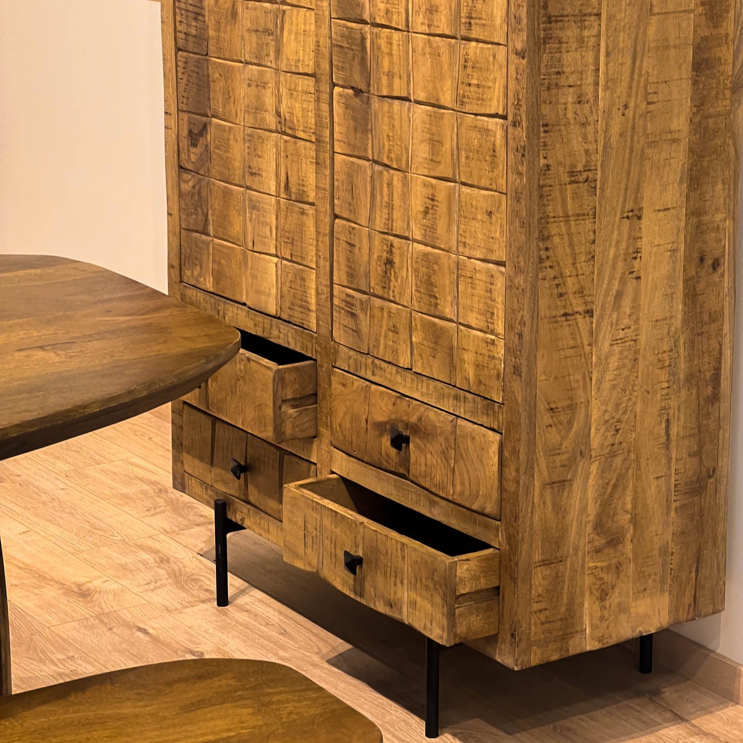 Le cabinet MARIA, fabriqué en bois de manguier avec un pied en métal, est une pièce de caractère alliant fonctionnalité et esthétique. Ce modèle présente deux portes et quatre tiroirs, offrant un espace de rangement polyvalent. L'incrustation de différentes bandes de bois laqué dans le cabinet et le motif en bloc incisé confèrent à la série MARIA de Zoli99 une allure unique. Avec des dimensions de 100 cm de large, 40 cm de profondeur et 180 cm de hauteur, ce cabinet s'impose comme un élément imposant et stylé dans votre espace. Le mariage du bois de manguier et du métal, associé au design raffiné, fait du cabinet MARIA une pièce maîtresse qui attire le regard. Son entretien est simple : il suffit de l'essuyer avec un chiffon légèrement humide pour préserver son élégance. Ajoutez une touche de sophistication et de praticité à votre intérieur avec le cabinet MARIA, une fusion parfaite de qualité artisanale et de style contemporain.