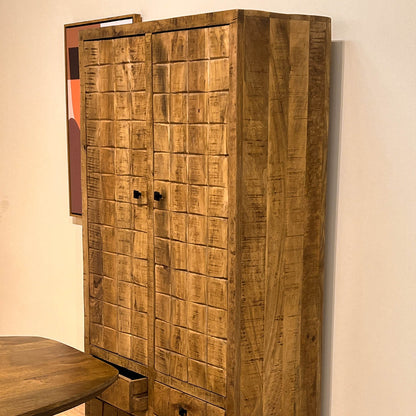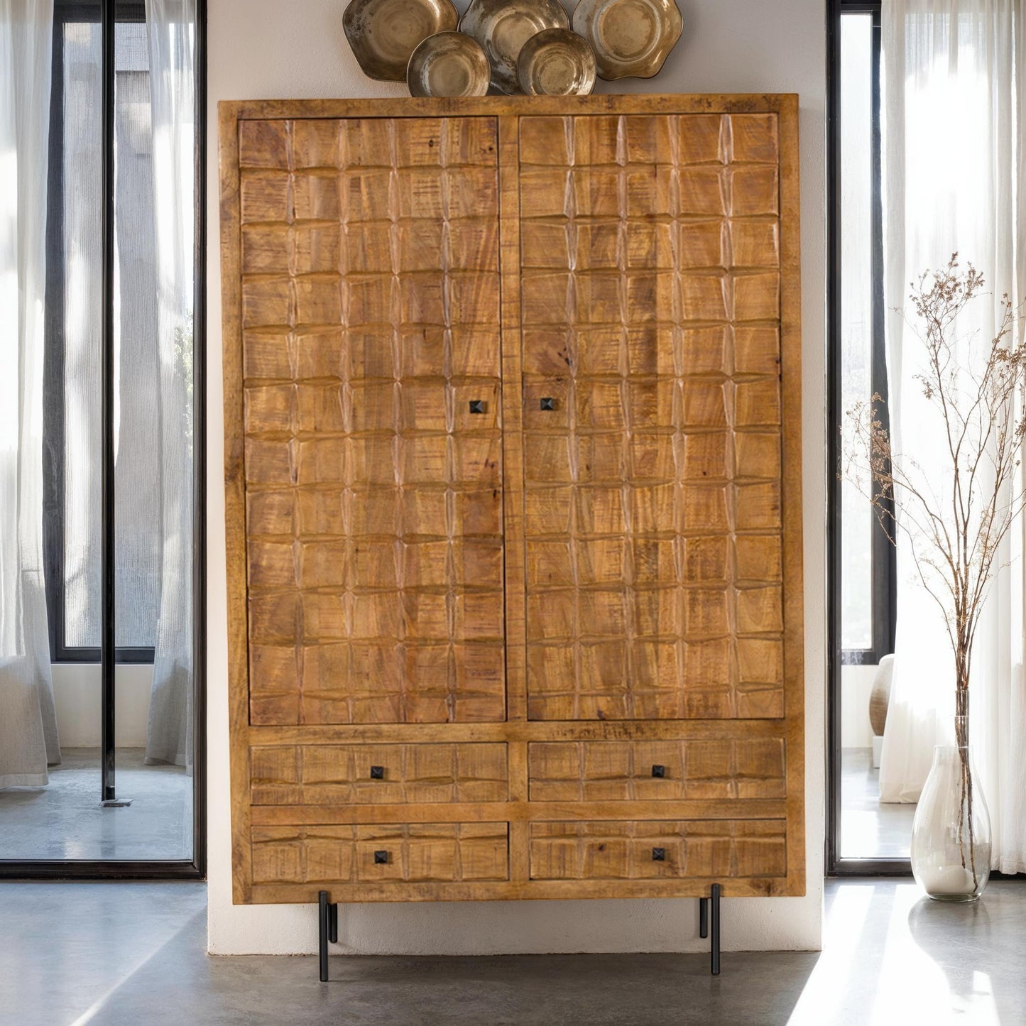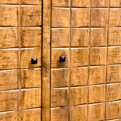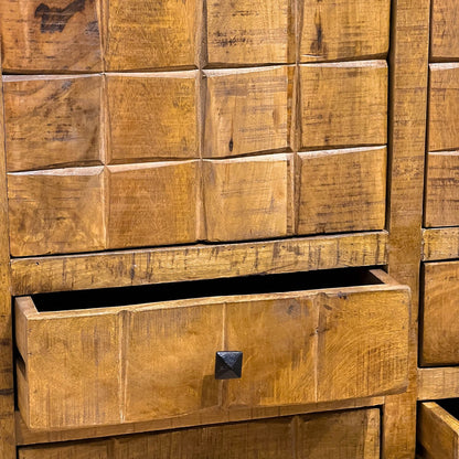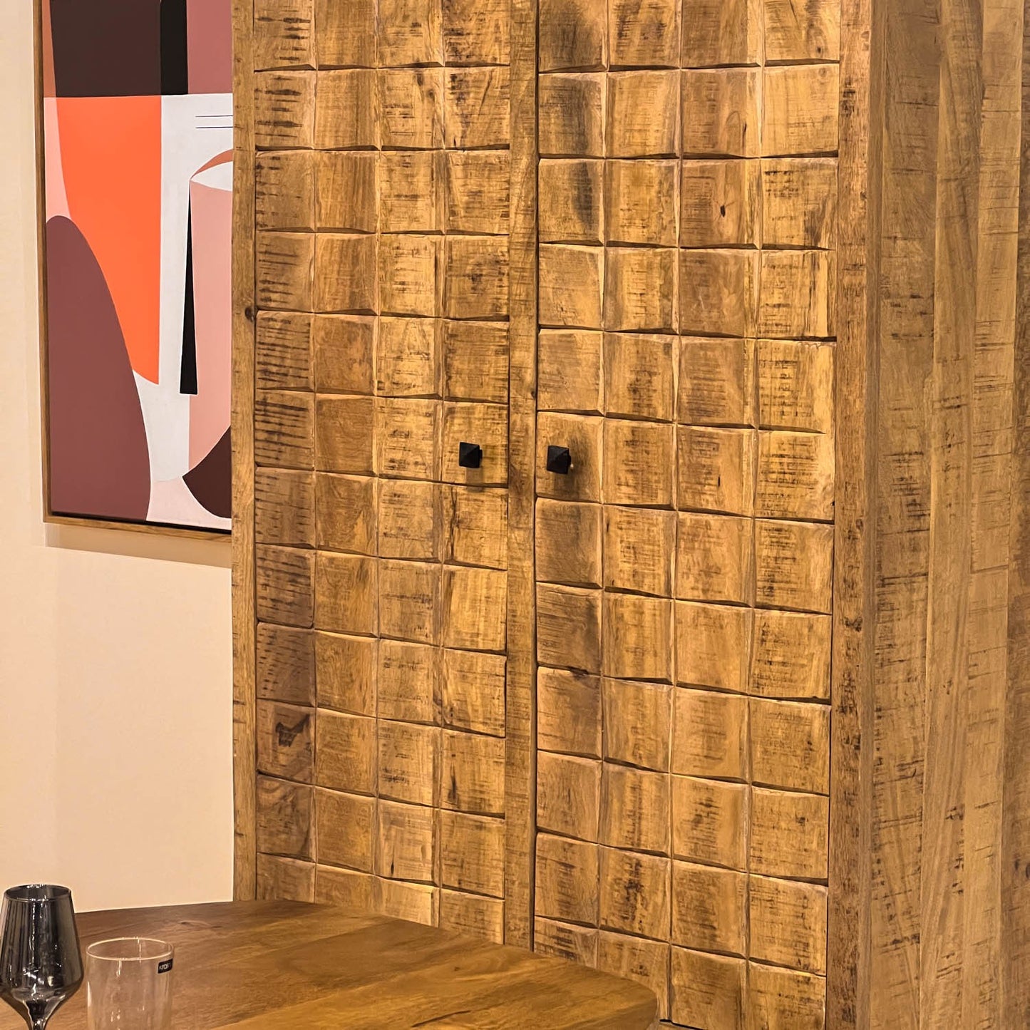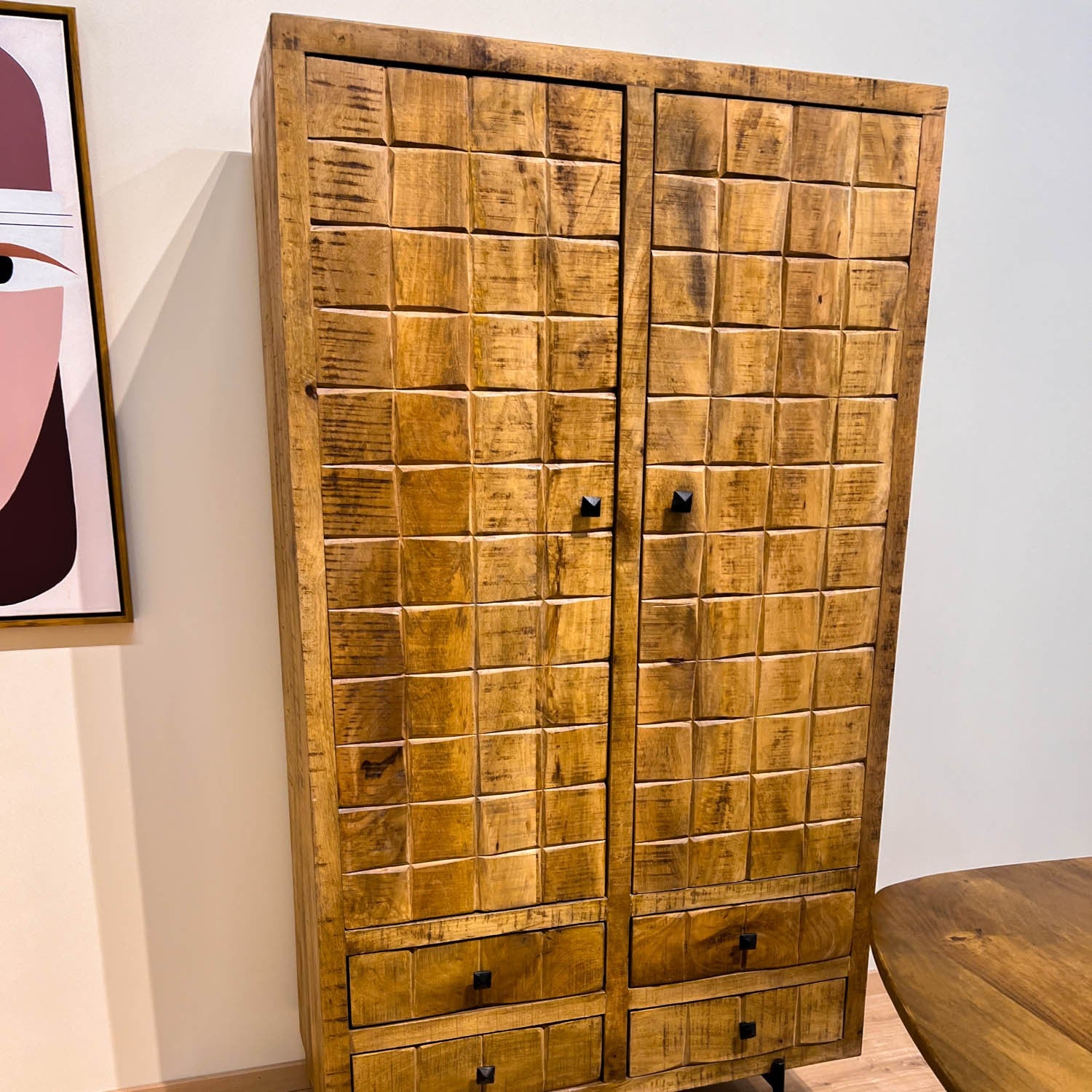 Le cabinet MARIA, fabriqué en bois de manguier avec un pied en métal, est une pièce de caractère alliant fonctionnalité et esthétique. Ce modèle présente deux portes et quatre tiroirs, offrant un espace de rangement polyvalent. L'incrustation de différentes bandes de bois laqué dans le cabinet et le motif en bloc incisé confèrent à la série MARIA de Zoli99 une allure unique. Avec des dimensions de 100 cm de large, 40 cm de profondeur et 180 cm de hauteur, ce cabinet s'impose comme un élément imposant et stylé dans votre espace. Le mariage du bois de manguier et du métal, associé au design raffiné, fait du cabinet MARIA une pièce maîtresse qui attire le regard. Son entretien est simple : il suffit de l'essuyer avec un chiffon légèrement humide pour préserver son élégance. Ajoutez une touche de sophistication et de praticité à votre intérieur avec le cabinet MARIA, une fusion parfaite de qualité artisanale et de style contemporain.